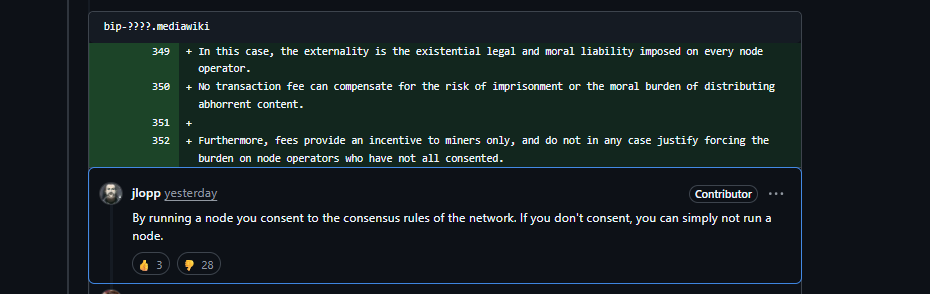 Lopp added, “By running a node, you consent to the consensus rules of the network. If you don’t consent, you can simply not run a node.”