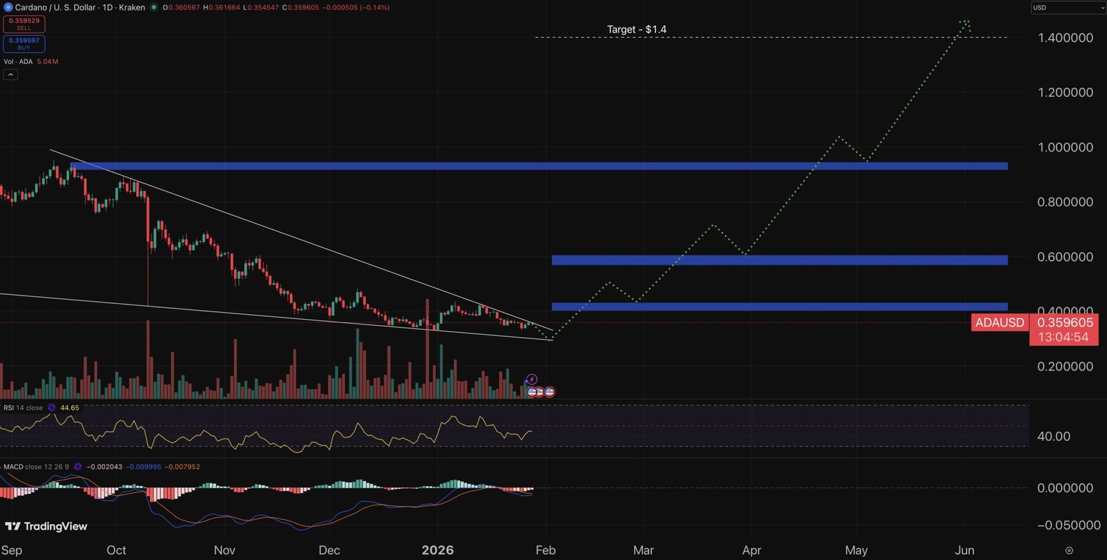 We also see that the Cardano price has been trading within a bullish pennant, which is about to converge towards a breakout point.