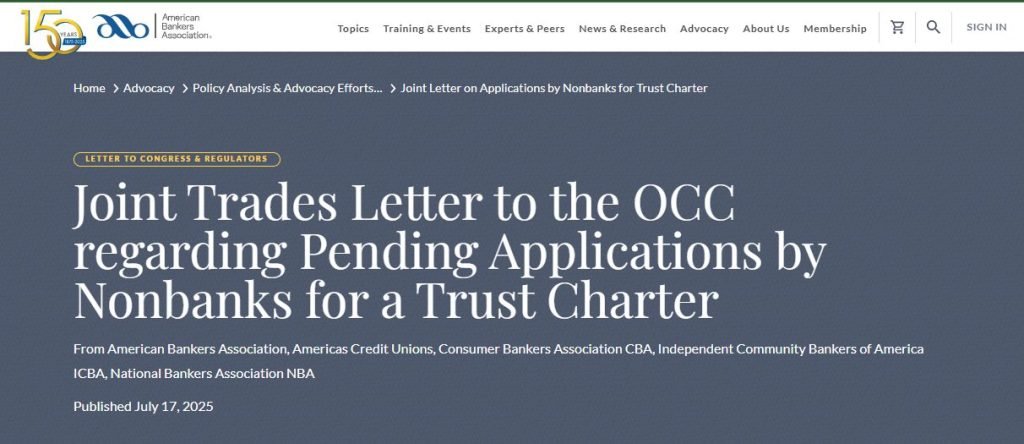 In July, the American Bankers Association (ABA), joined by other banking and credit union associations, sent a letter urging the OCC to pause crypto-related charter approvals.