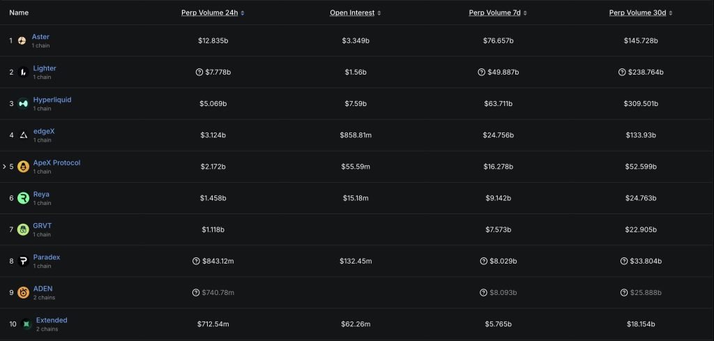 Despite those data gaps, Aster continues to post dominant figures. As of this week, it tops DeFiLlama’s 24-hour and seven-day perpetual trading volume charts, surpassing competitors like Hyperliquid and Lighter.