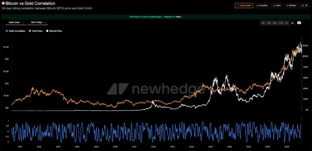 Data shows that while Bitcoin surged 150% since the start of 2024, gold rose by about 100% during the same period, though its recent rally has outpaced Bitcoin’s consolidation phase.