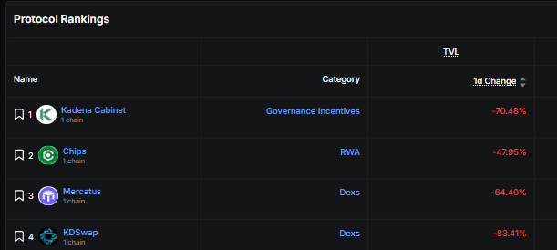 Most of its DeFi protocols have suffered sharp declines in liquidity. Kadena Cabinet, a governance platform, dropped over 70% in TVL in the last day, while decentralized exchanges like KDSwap and Mercatus fell by 83% and 64%, respectively.
