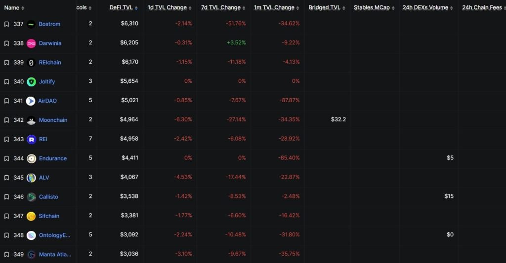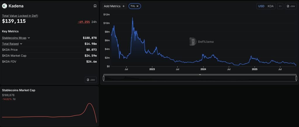 According to data from DeFiLlama, Kadena’s total value locked in DeFi has plunged to just $128,000, down 71% in 24 hours and a far cry from its all-time high of $11 million in August 2022.