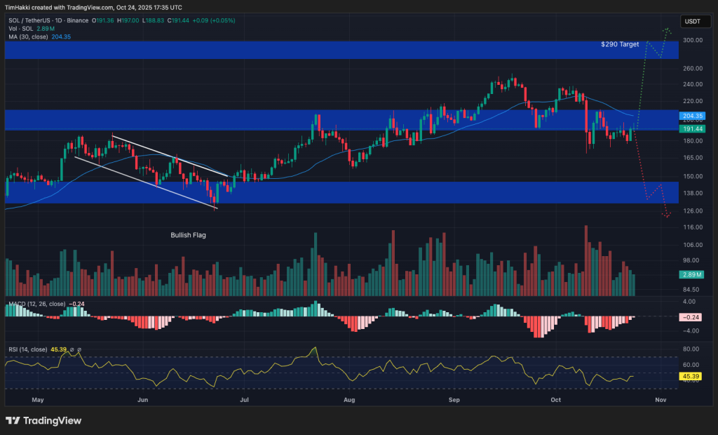 After peaking at $250 in January and dipping to $100 in April, SOL now trades near $191, signaling renewed upside potential. With an RSI around 45 and trading just below its 30-day moving average, the token appears undervalued.