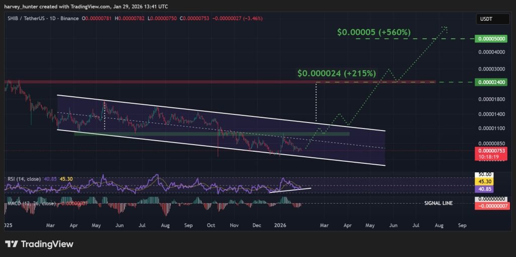 A stronger fundamental footing could give Shiba Inu the foundation it needs to finally escape the ten-month consolidation that has held it in a descending channel pattern.