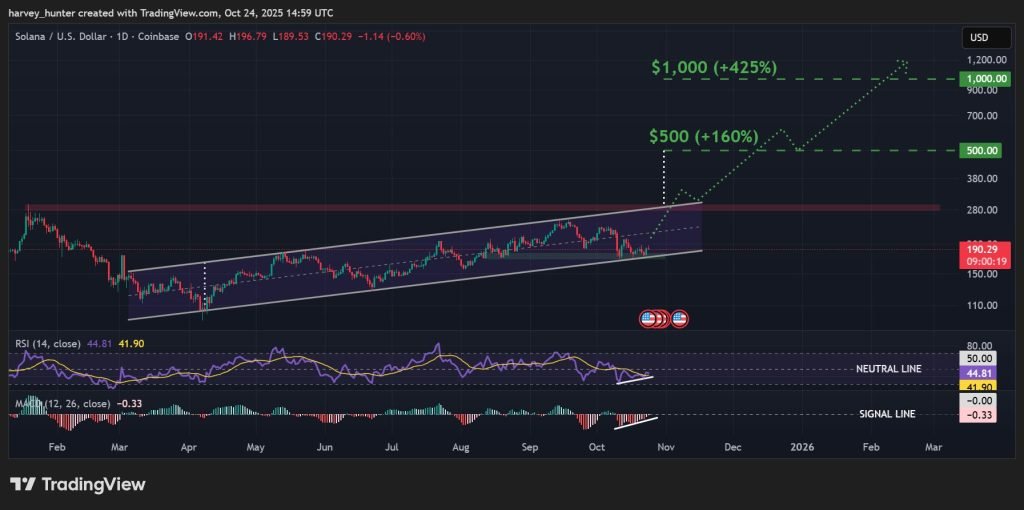 Still, as Solana enters mainstream corporate balance sheets and institutional exposure deepens through spot ETF, the rally could extend another 425%, propelling SOL toward $1,000.
