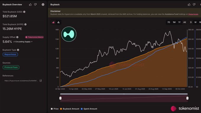 Hyperliquid has been making continuous token buybacks amounting to over $521 million. These buybacks have replaced more than 5.6% of the circulating supply, which demonstrates steady protocol revenue. The gradual withdrawal of liquid supply has acted as a buffer when corrections were made recently and has thus created good grounds of recovery.