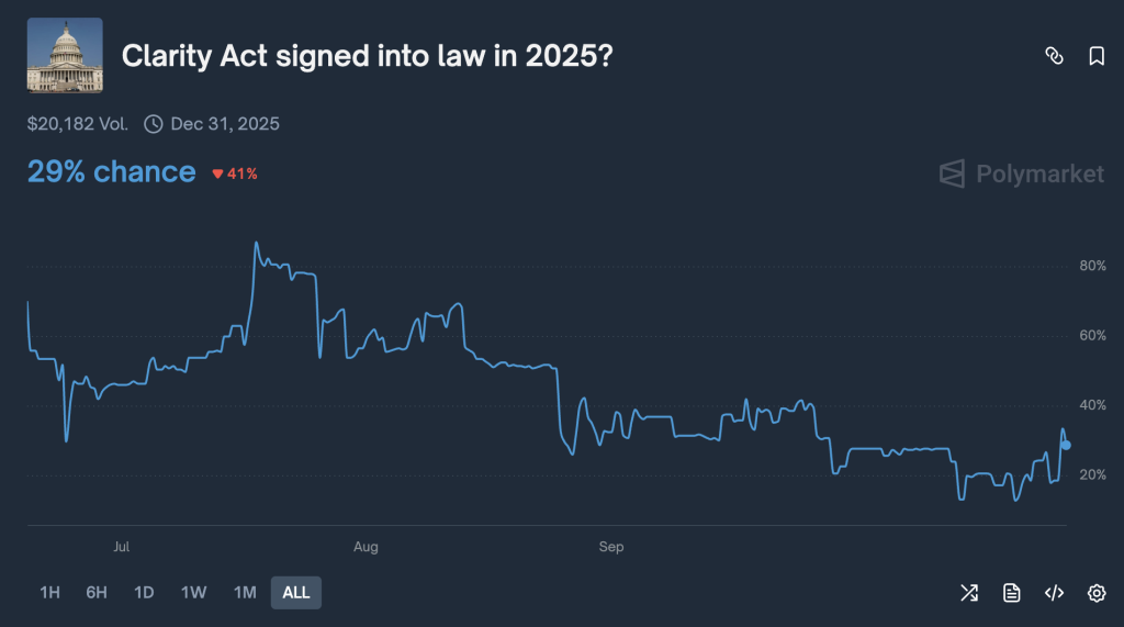 Still, many remain skeptical about the timeline. Prediction market data from Polymarket shows only about a 20% chance that the CLARITY Act will become law by the end of 2025, down sharply from 87% in mid-July.