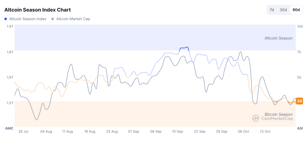 Altcoin Season Index sits near 24, which indicates thin breadth and a market still led by Bitcoin trends. Even with green prints in select names, allocation remains selective and event-driven.