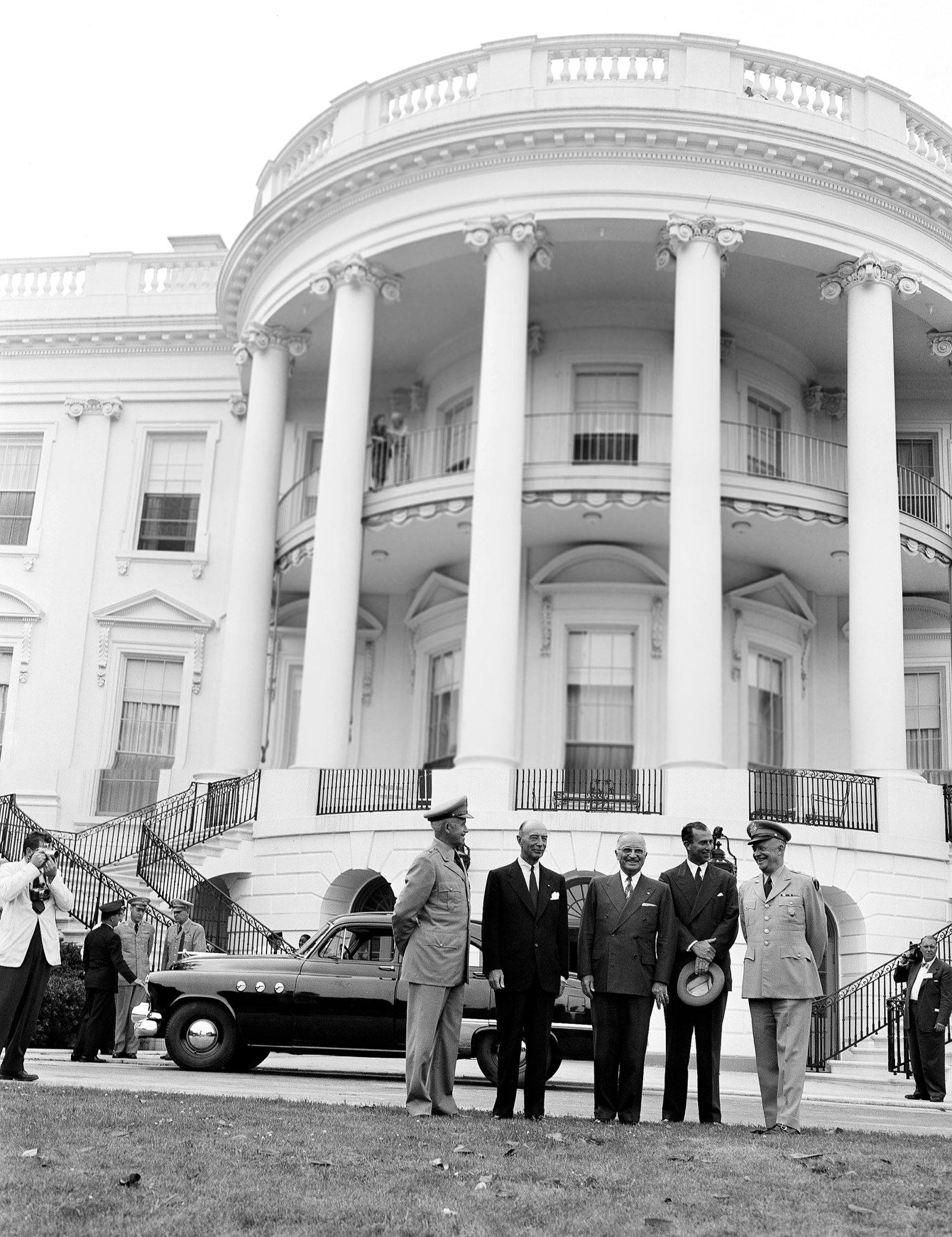 President Harry S. Truman greets his generals on south lawn of the newly completed White House on June 1, 1952, as First Lady Bess Truman and daughter Margaret hang over the railing of the new Truman balcony. Left to right: Gen. Omar Bradley; Secretary of Defense Robert Lovett; President Harry S. Truman; Secretary of the Army Frank Pace; and Gen. Dwight D. Eisenhower. (AP Photo/Charles Gorry)