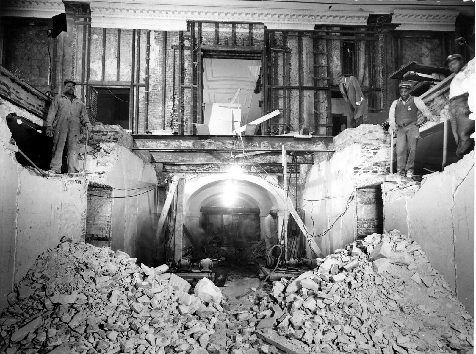 Workmen remove a wall of the White House during renovation on April 12, 1950. (Smith Collection/Gado/Getty Images).