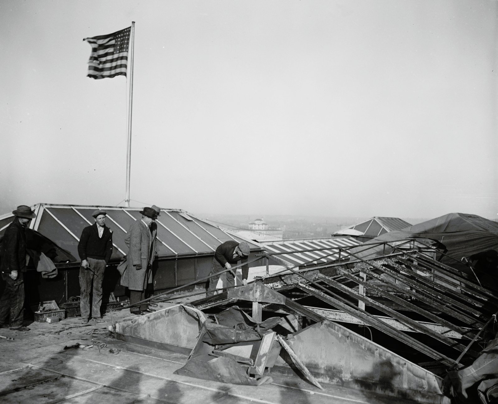 Workers inspect the roof of the White House in January 1930, to review the damage from a Christmas Eve fire. (Library of Congress/Interim Archives/Getty Images)
