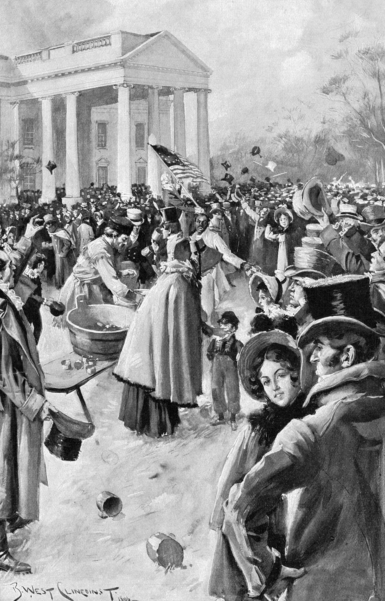 The surging crowd made mingling impossible, and as people pushed toward Jackson and lunged toward refreshments, they collided with fragile furniture and shoved servants laden with punch bowls and trays of food. Waiters trying to maneuver with a large bowl of spiked orange punch crashed into a crowd and spilled it all on the carpet. Men in work boots, straining to see Jackson, stood on expensive upholstered furniture