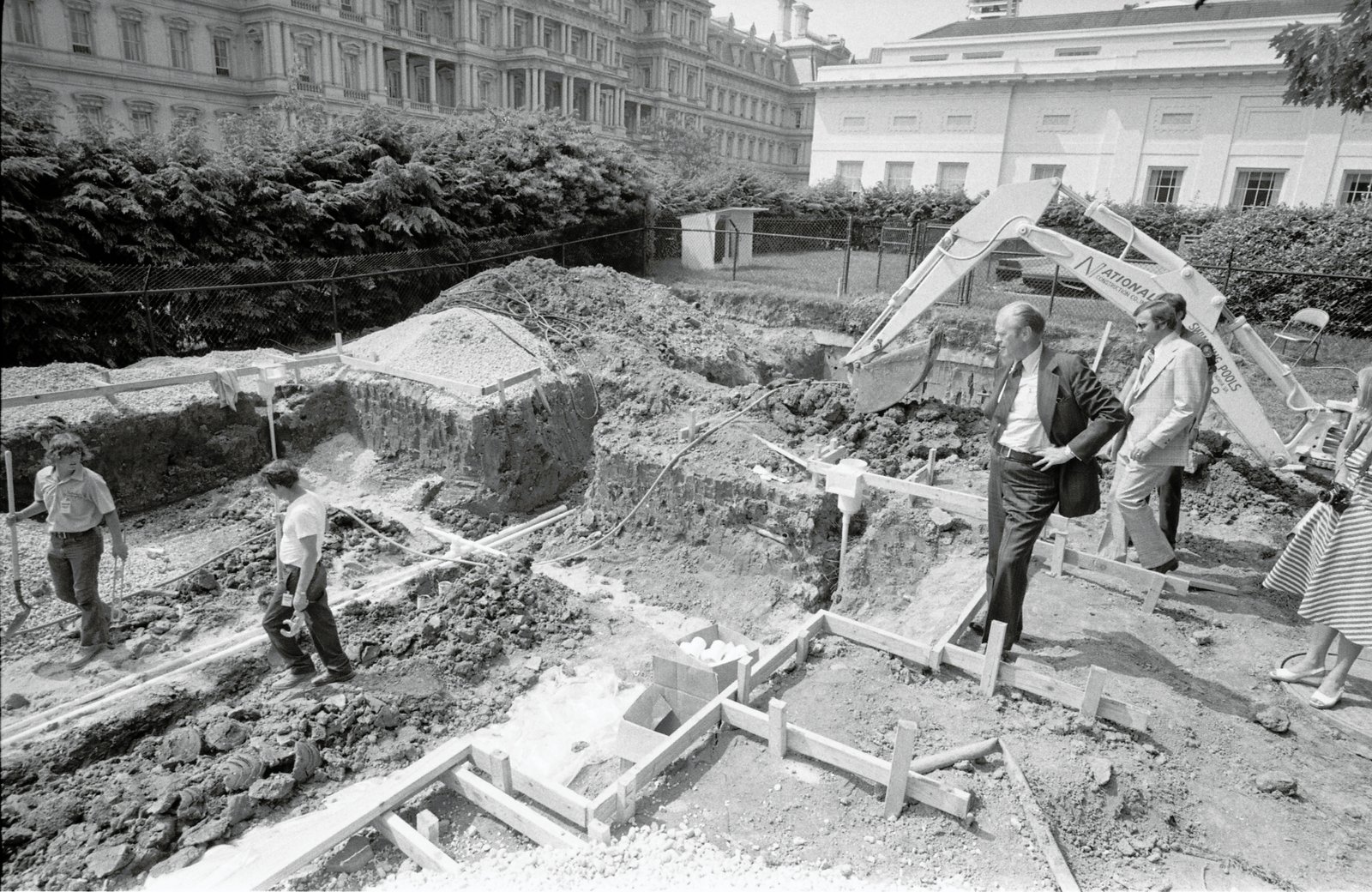 President Gerald Ford inspects the construction site for his White House swimming pool on May 20, 1975. (U.S. National Archives and Records Administration)