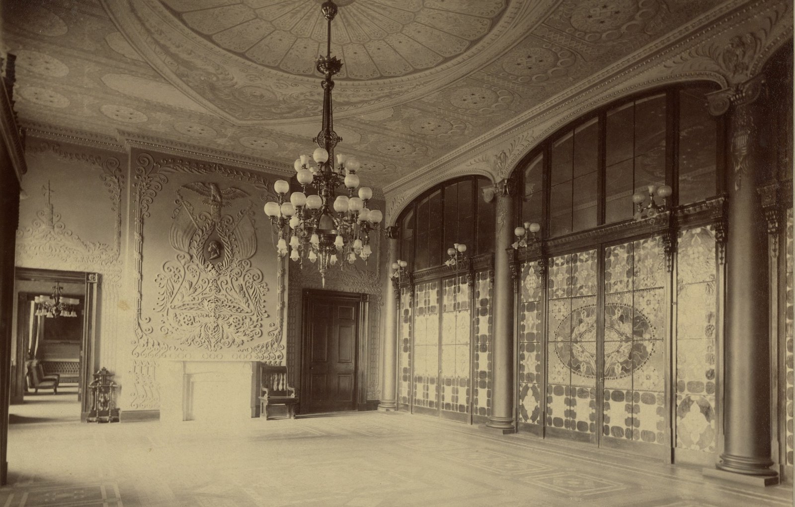 The North Entrance Hall of the White House showing Chester Arthur’s Tiffany stained-glass screen, circa 1890s. Teddy Roosevelt removed the stained-glass in 1902 and complete redid the room. (Wikimedia Commons)