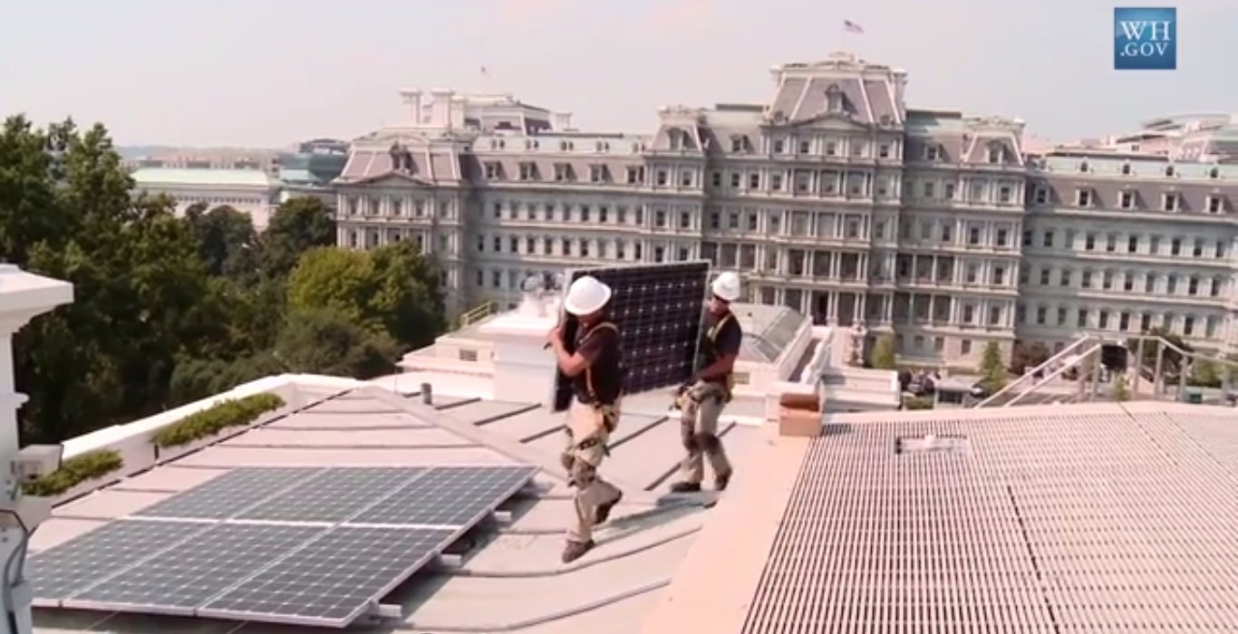 Workers install photovoltaic solar panels on the roof of the White House during the Obama administration in May 2014. (Obama White House video)