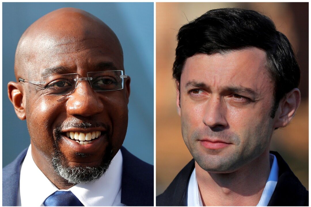 Democratic U.S. Senate candidates Rev. Raphael Warnock and Jon Ossoff are seen in a combination of file photographs as they campaign on Jan. 5, 2021. Reuters