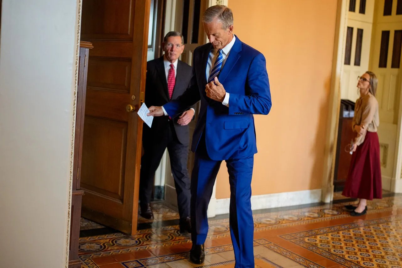 WASHINGTON, DC – OCTOBER 15: Senate Majority Leader John Thune (R-SD) (C), accompanied by Senate Majority Whip John Barrasso (R-WY) (L), walks out of a weekly Republican policy luncheon at the U.S. Capitol Building on October 15, 2025 in Washington, DC. (Photo by Andrew Harnik/Getty Images)