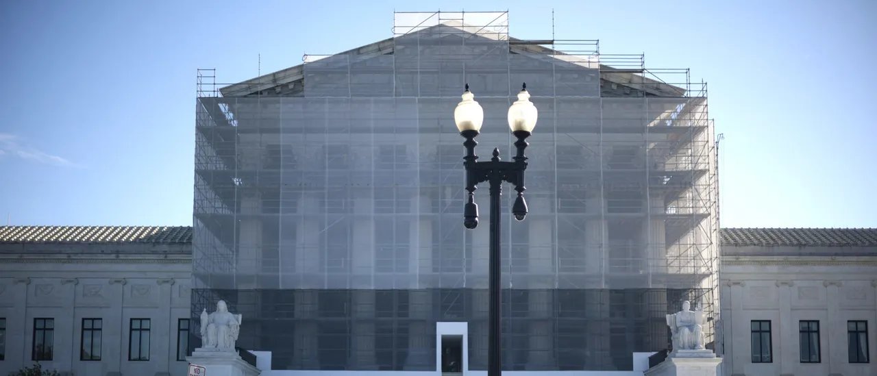 WASHINGTON, DC – OCTOBER 06: U.S. Supreme Court Police stand behind security barriers in front of the Court building, which is obscured in construction scaffolding, on the first day of the Court’s new term on October 06, 2025 in Washington, DC. (Photo by Chip Somodevilla/Getty Images)