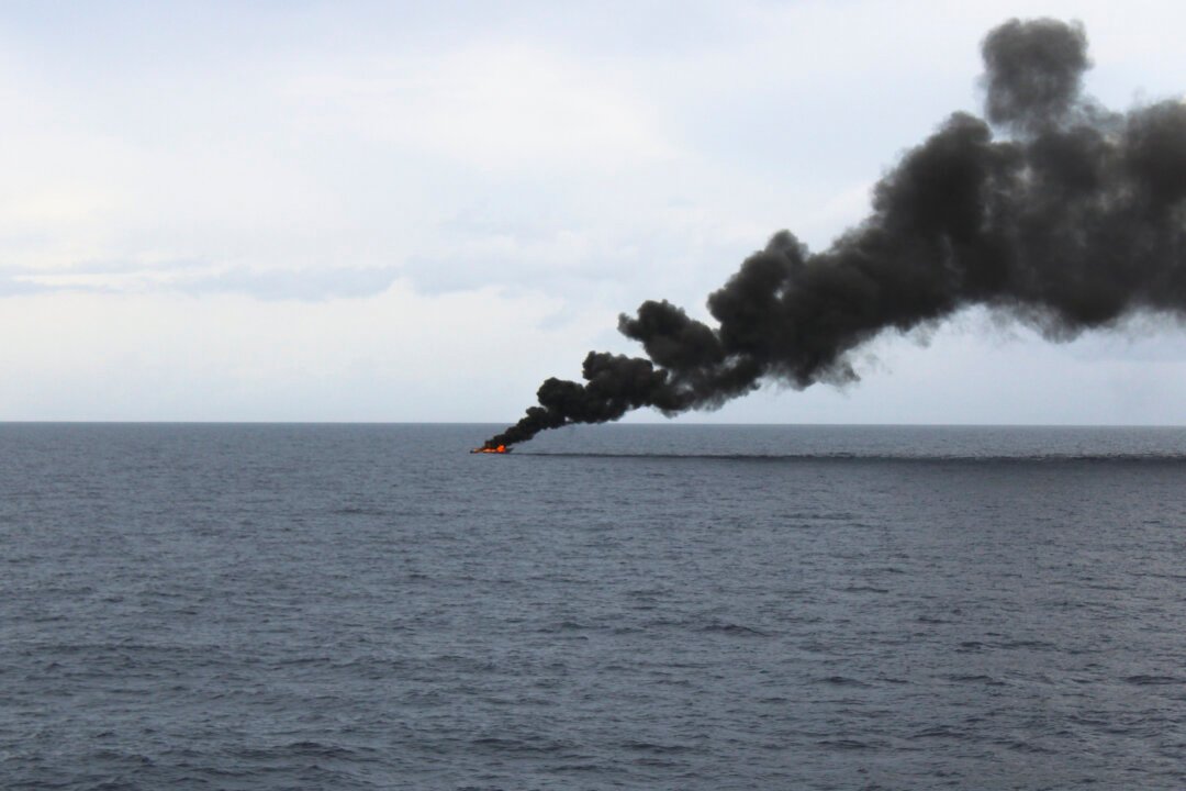 A suspected drug smuggling vessel burns the day after a Coast Guard crew fired on it in the Caribbean Sea, on Sept. 7, 2025. U.S. Coast Guard