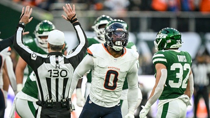 LONDON , ENGLAND – OCTOBER 12: Jonathon Cooper (0) of the Denver Broncos celebrates after sacking Justin Fields (7) of the New York Jets to seal the deal during the fourth quarter of the Broncos’ 13-11 win at Tottenham Hotspur Stadium in London on Sunday, October 12, 2025. (Photo by AAron Ontiveroz/The Denver Post)
