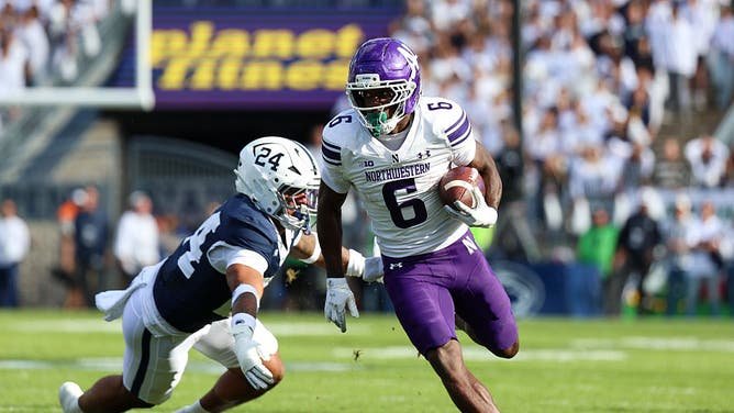 STATE COLLEGE, Pa. – Joseph Himon II of the Northwestern Wildcats runs the ball against Corey Smith of the Penn State Nittany Lions at Beaver Stadium on October 11, 2025. (Photo by Isaiah Vazquez/Getty Images)
