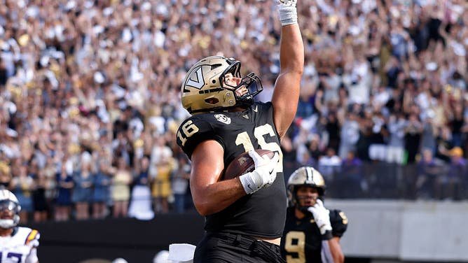 NASHVILLE – Cole Spence of the Vanderbilt Commodores celebrates after a touchdown catch against the LSU Tigers at FirstBank Stadium on October 18, 2025. (Photo by Johnnie Izquierdo/Getty Images)