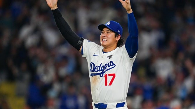 LOS ANGELES, CA – OCTOBER 27: Shohei Ohtani #17 of the Los Angeles Dodgers celebrates after defeating the Toronto Blue Jays in Game Three of the 2025 World Series presented by Capital One at Dodger Stadium on Monday, October 27, 2025 in Los Angeles, California. (Photo by Mary DeCicco/MLB Photos via Getty Images)
