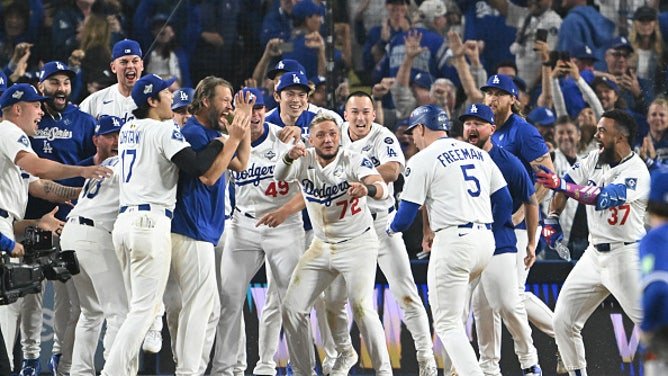 Los Angeles, CA – October 27:Dodger teammates greet Freddie Freeman (5) after he hit a walk-off home run in the bottom of the 18th inning in game 3 of the World Series at Dodger Stadium on Monday, October 27, 2025. The Dodgers won the epic game 6-5 and take a 2-1 lead in the series. (Photo by David Crane/MediaNews Group/Los Angeles Daily News via Getty Images) lacatrina andante