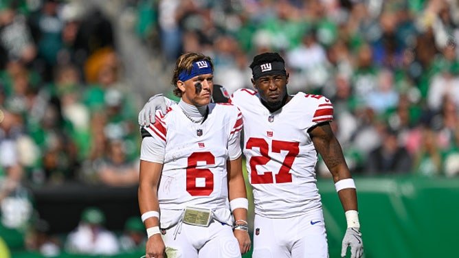 PHILADELPHIA, PA – OCTOBER 26: New York Giants quarterback Jaxson Dart #6 and New York Giants safety Tyler Nubin #27 console each other after New York Giants running back Cam Skattebo #44 is injured during the game between the New York Giants and the Philadelphia Eagles on October 26th, 2025 at Lincoln Financial Field in Philadelphia, PA. (Photo by Terence Lewis/Icon Sportswire via Getty Images)