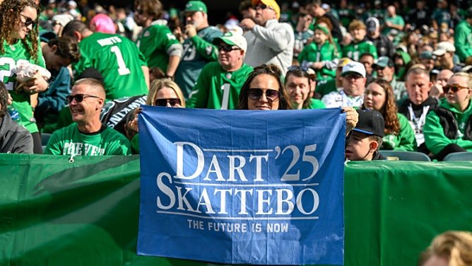 PHILADELPHIA, PA – OCTOBER 26: A fan holds up a sign for New York Giants quarterback Jaxson Dart #6 and New York Giants running back Cam Skattebo #44 during the game between the New York Giants and the Philadelphia Eagles on October 26th, 2025 at Lincoln Financial Field in Philadelphia, PA. (Photo by Terence Lewis/Icon Sportswire via Getty Images)