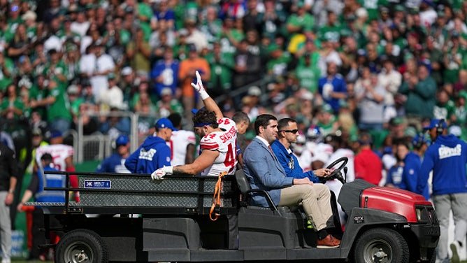 PHILADELPHIA, PENNSYLVANIA – OCTOBER 26: Cam Skattebo #44 of the New York Giants is carted off the field after an injury against the Philadelphia Eagles at Lincoln Financial Field on October 26, 2025 in Philadelphia, United States. (Photo by Mitchell Leff/Getty Images)