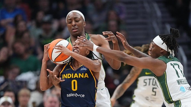 Nneka Ogwumike of the Seattle Storm plays defense against Kelsey Mitchell of the Indiana Fever during the first half at Climate Pledge Arena on Sunday. (Photo by Soobum Im/Getty Images)