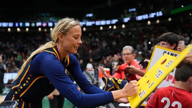 Sophie Cunningham of the Indiana Fever signs an autograph for a basketball fan after the game against the Seattle Storm on Sunday. (Photo by Soobum Im/Getty Images)