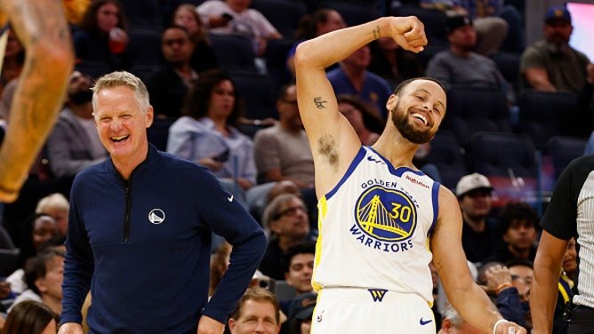 From left: Golden State Warriors head coach Steve Kerr and Warriors guard Stephen Curry (30) have a laugh in the fourth quarter during an NBA preseason game against the LA Clippers at Chase Center in San Francisco, Friday, Oct. 17, 2025. The Clippers won 106-103. (Photo by Santiago Mejia/San Francisco Chronicle via Getty Images)