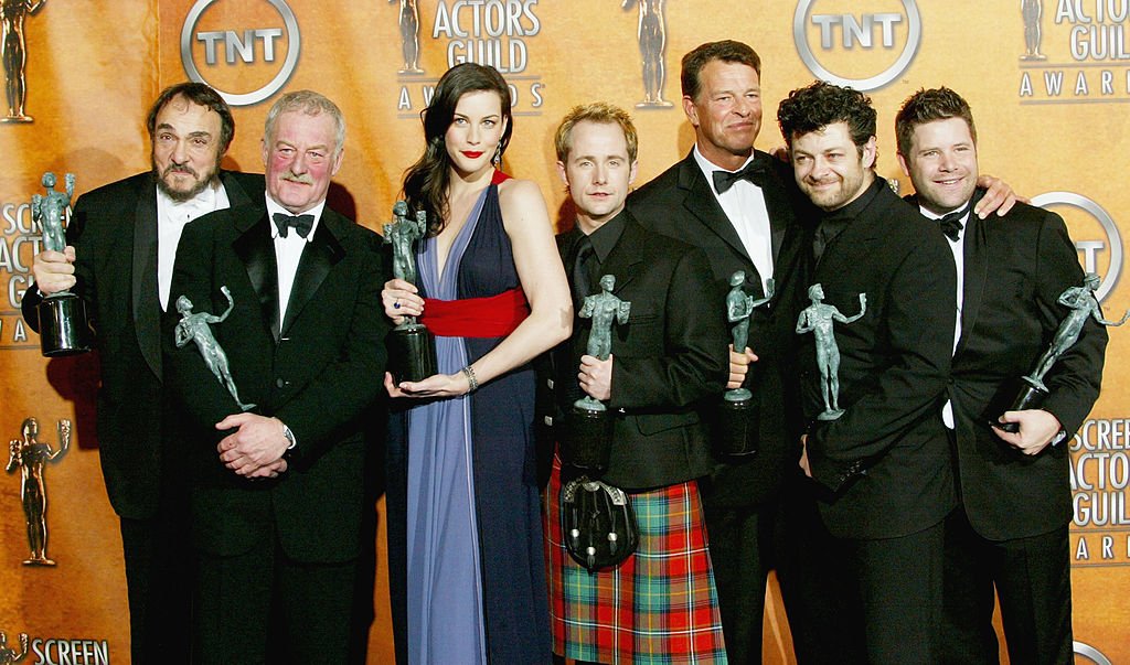LOS ANGELES – FEBRUARY 22: (L-R) Actors John Rhys-Davies, Bernard Hill, Liv Tyler, Billy Boyd, John Noble, Andy Serkis, and Sean Astin pose backstage with their awards for Outstanding Performance by a Cast in a Motion Picture for “Lord of the Rings: The Return of the King” during the 10th Annual Screen Actors Guild Awards at the Shrine Auditorium on February 22, 2004 in Los Angeles, California. (Photo by Frederick M. Brown/Getty Images)